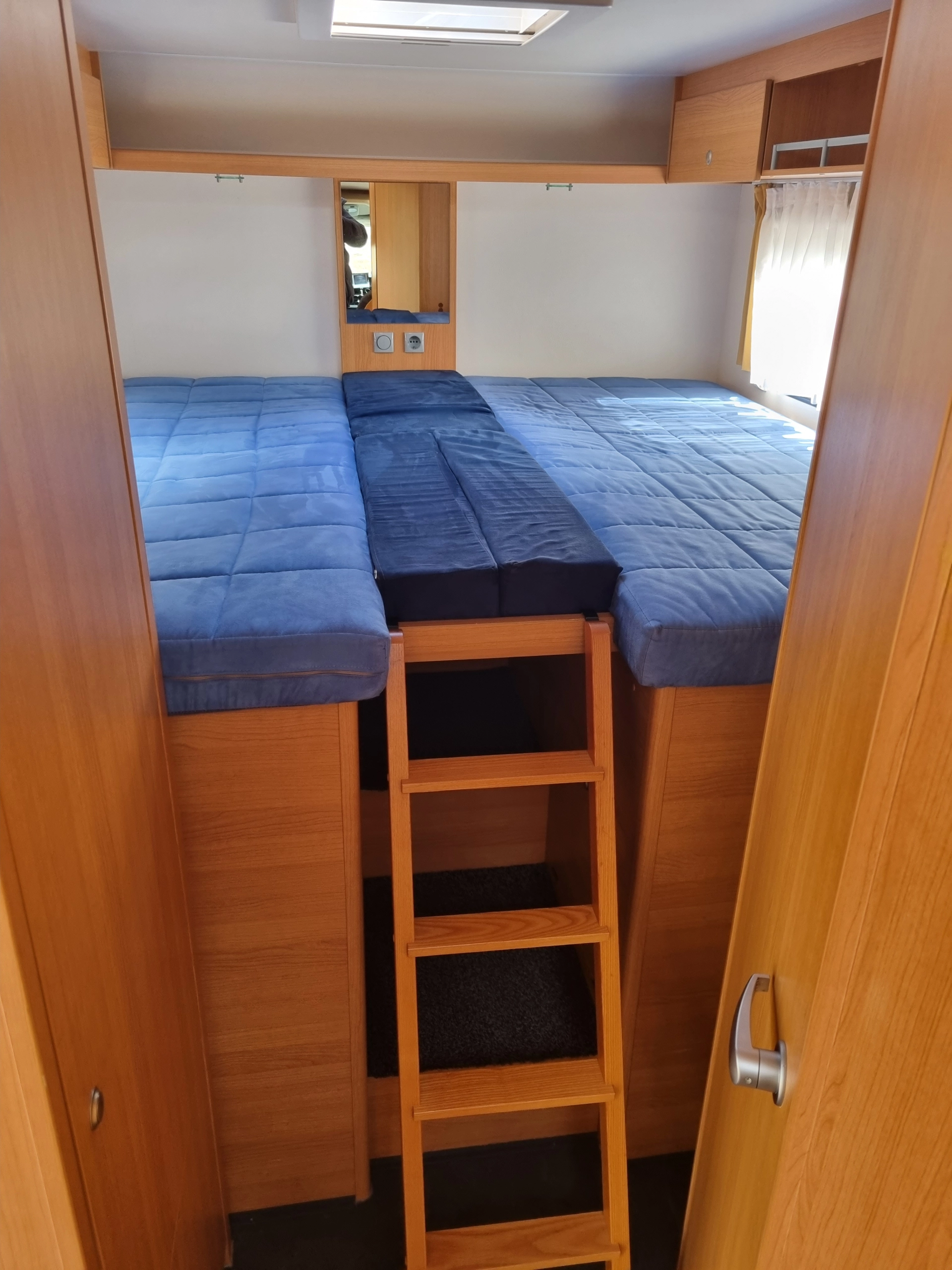 De camper is voorzien van 2 aparte lengtebedden van ieder 70x200 cm, die makkelijk te betreden zijn middels een grote opstap. Van de 2 bedden kan eenvoudig 1 groot bed gemaakt worden, afmetingen 200x200 cm. Deze is te betreden met een trapje. Optioneel is er van het zitje een extra bed te maken met afmetingen 70x160 cm.
