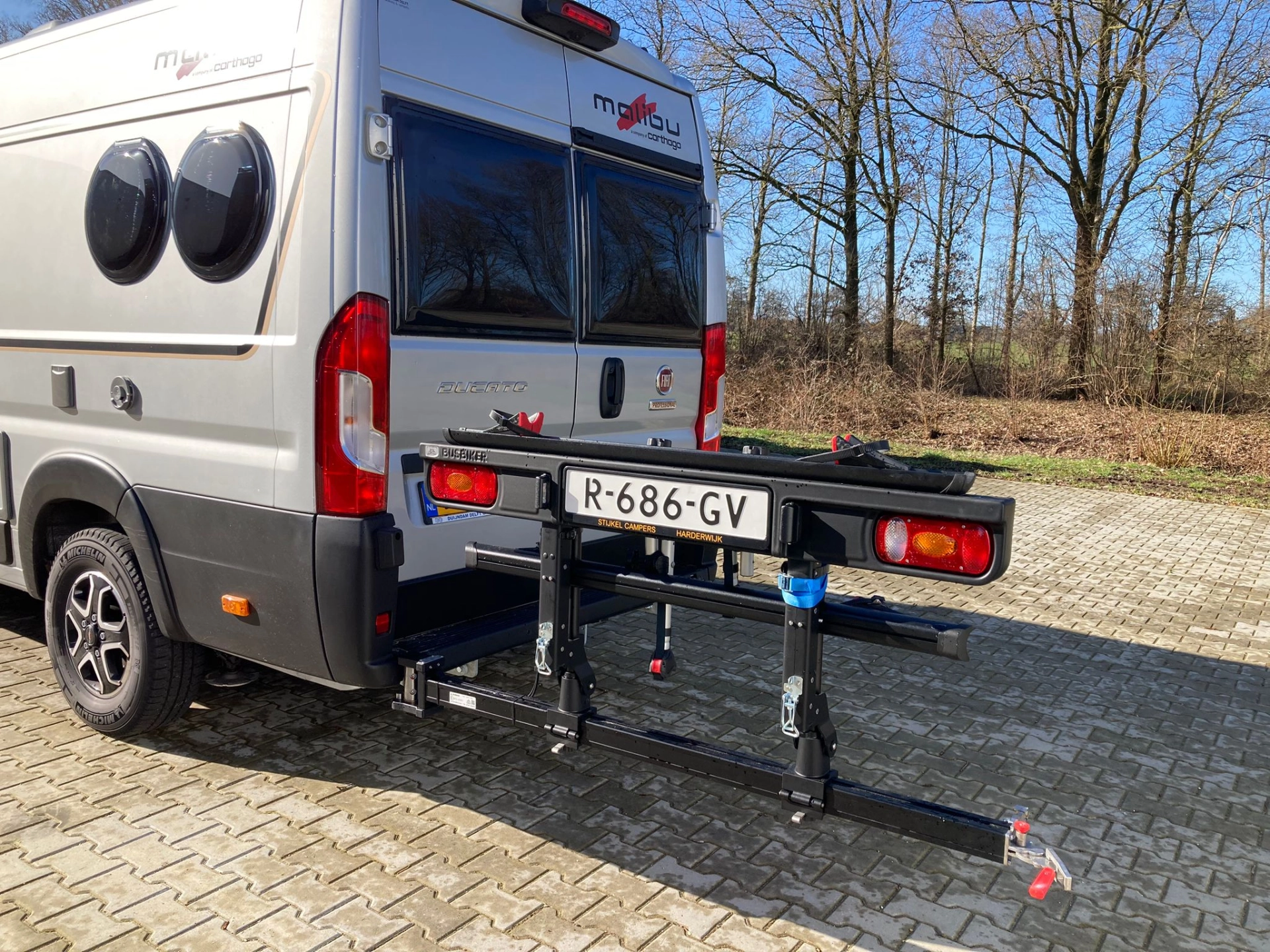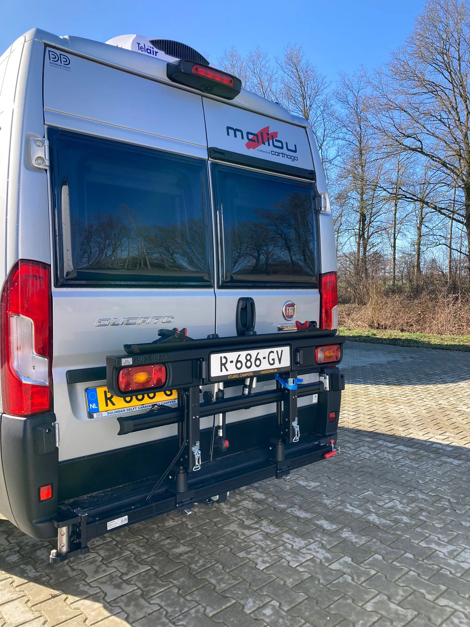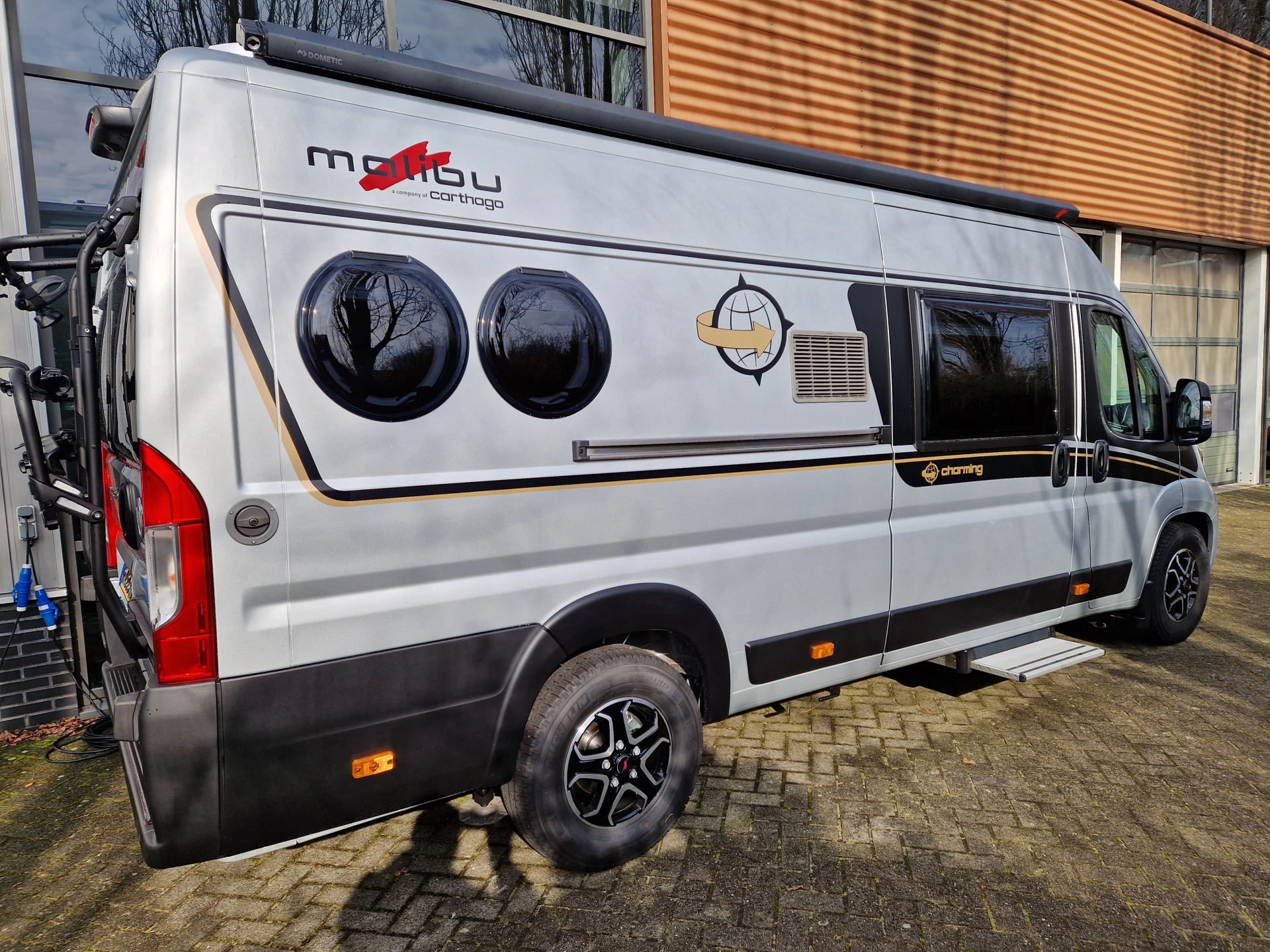 Deze zo goed als nieuwe zilvergrijs-zwarte Malibu (van Carthago) buscamper is misschien wel de meest complete buscamper in Nederland. Met leren bekleding, licht hout, panoramadak, airco, automaat, 180 pk motor, nieuwe Fiat Ducato cockpit voorzien van alle opties, en een E&P levelling systeem. Van de enkele bedden kan ook 1 groot bed gemaakt worden. De camper is zonder fietsendrager- 6.39 cm lang. De wegdraaibare fietsendrager achterop is geschikt voor 2 elektrische fietsen.