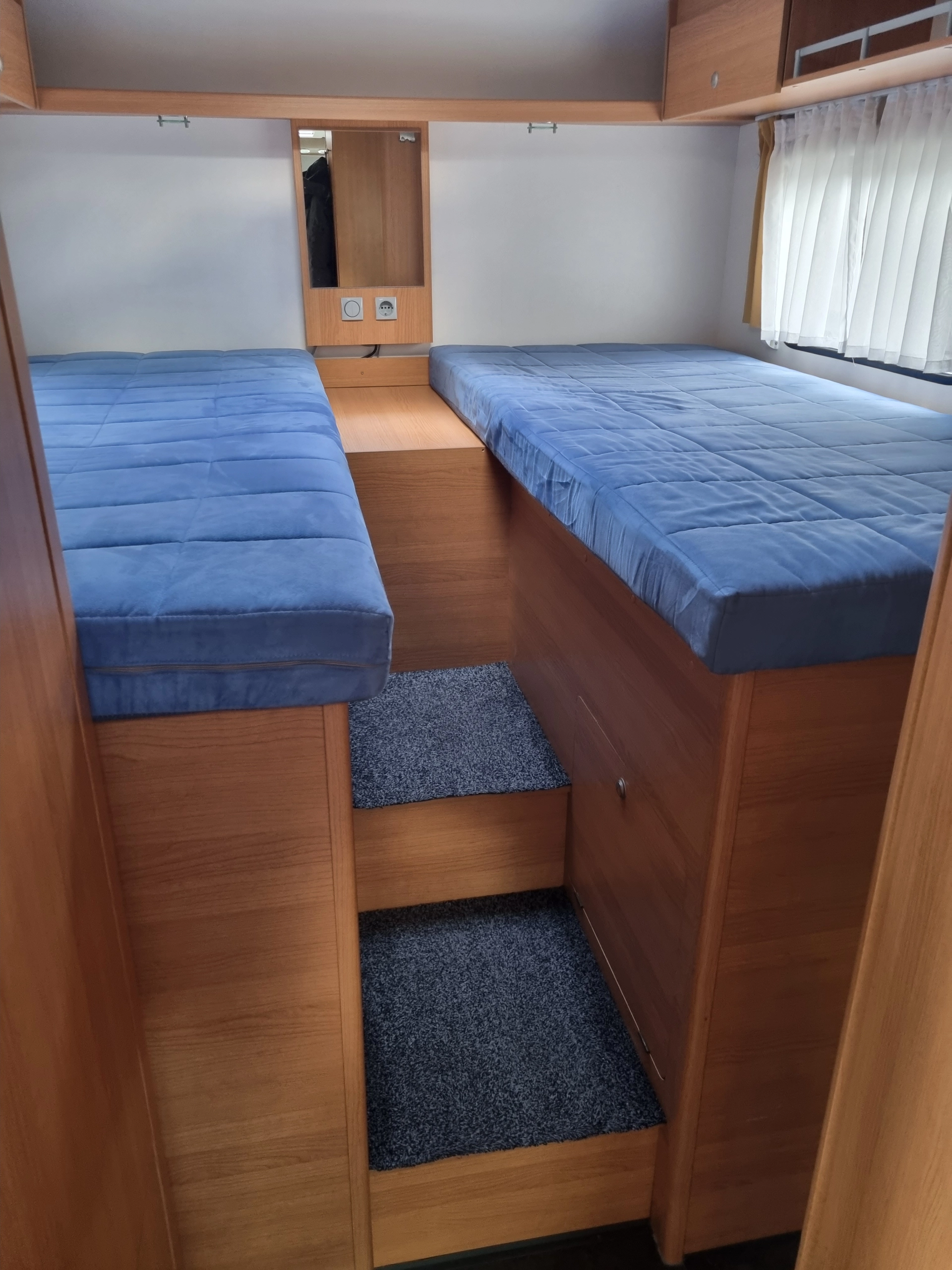 De camper is voorzien van 2 aparte lengtebedden van ieder 70x200 cm, die makkelijk te betreden zijn middels een grote opstap. Van de 2 bedden kan eenvoudig 1 groot bed gemaakt worden, afmetingen 200x200 cm. Deze is te betreden met een trapje. Optioneel is er van het zitje een extra bed te maken met afmetingen 70x160 cm.